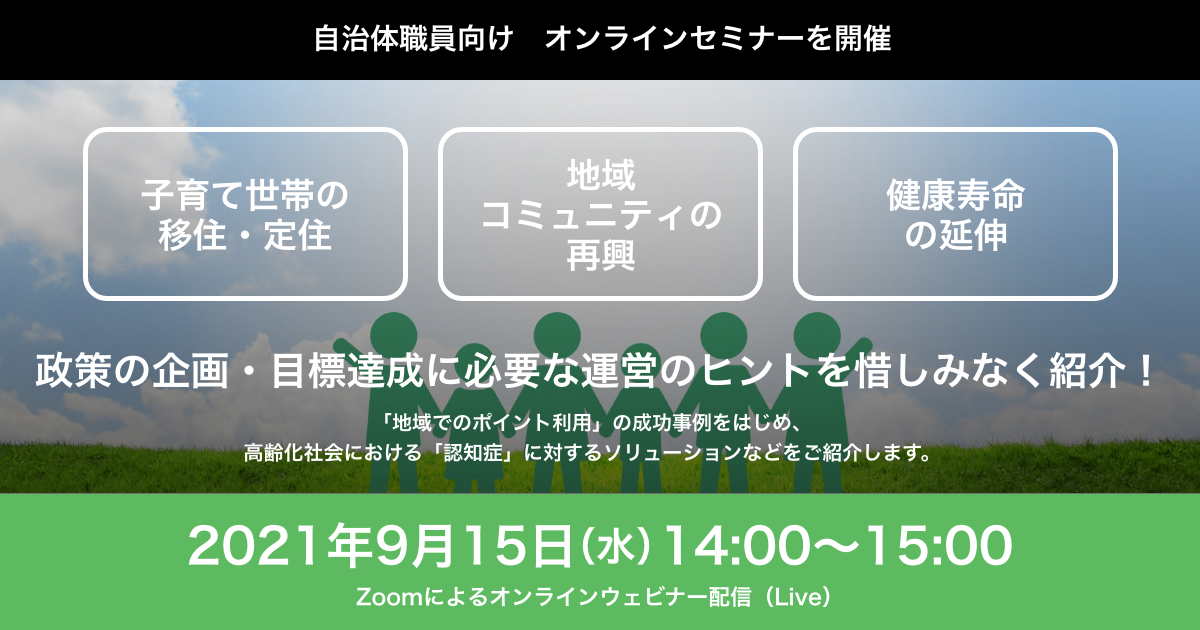 PRESS / GROUP株式会社フューチャーヒット(本社:大阪府大阪市、代表取締役:谷孝大、以下「フューチャーヒット」)は、自治体職員を対象に、人口減少社会における「子育て世帯の移住・定住促進」、官民連携・市民共創による「地域コミュニティ再興」や「スポーツ振興などによる健康増進」、超高齢化社会での「健康寿命延伸」など、多くの自治体で共通する地域課題を解決するための企画と事業運営、掲げている政策目標達成のポイントを、奈良市でのポイント事業の事例を交えて紹介する無料オンラインセミナー(ウェビナー)を9月15日(水)に開催します。