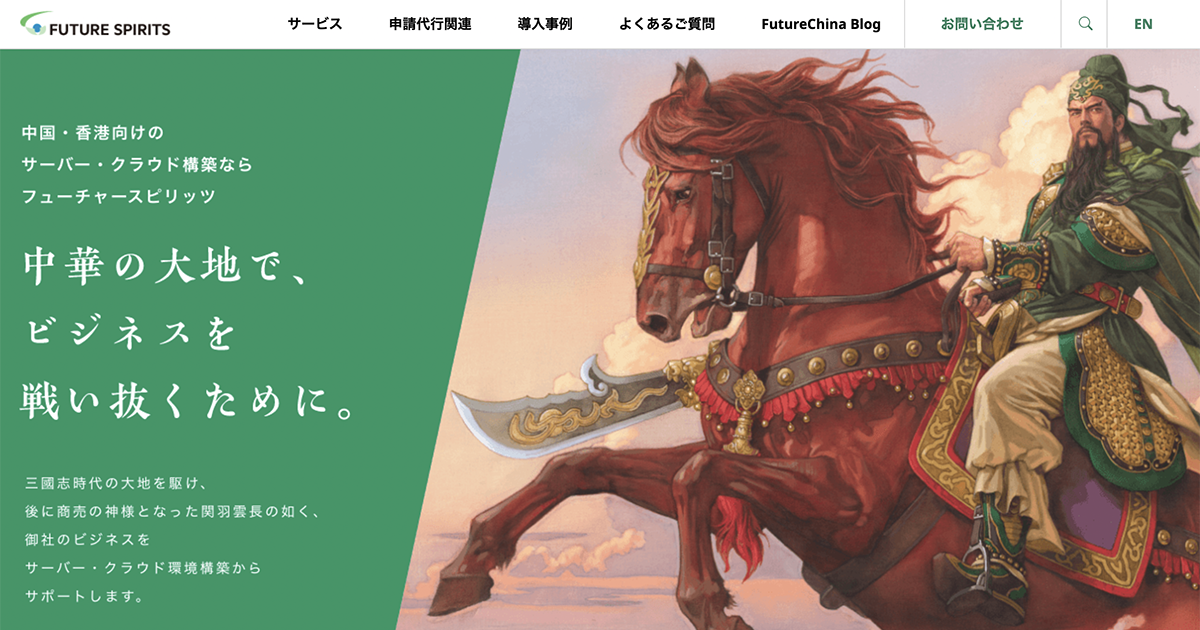 青龍偃月刀を手に馬上から彼方を見つめる関羽雲長の雄姿は、中国大陸で事業に奮闘するお客様の勇姿でもあります。中華の大地で、ビジネスを戦い抜くために。フューチャースピリッツは、中国でビジネスを展開するお客様をIT面で支援する「頼れる味方」でありたいと願っております。