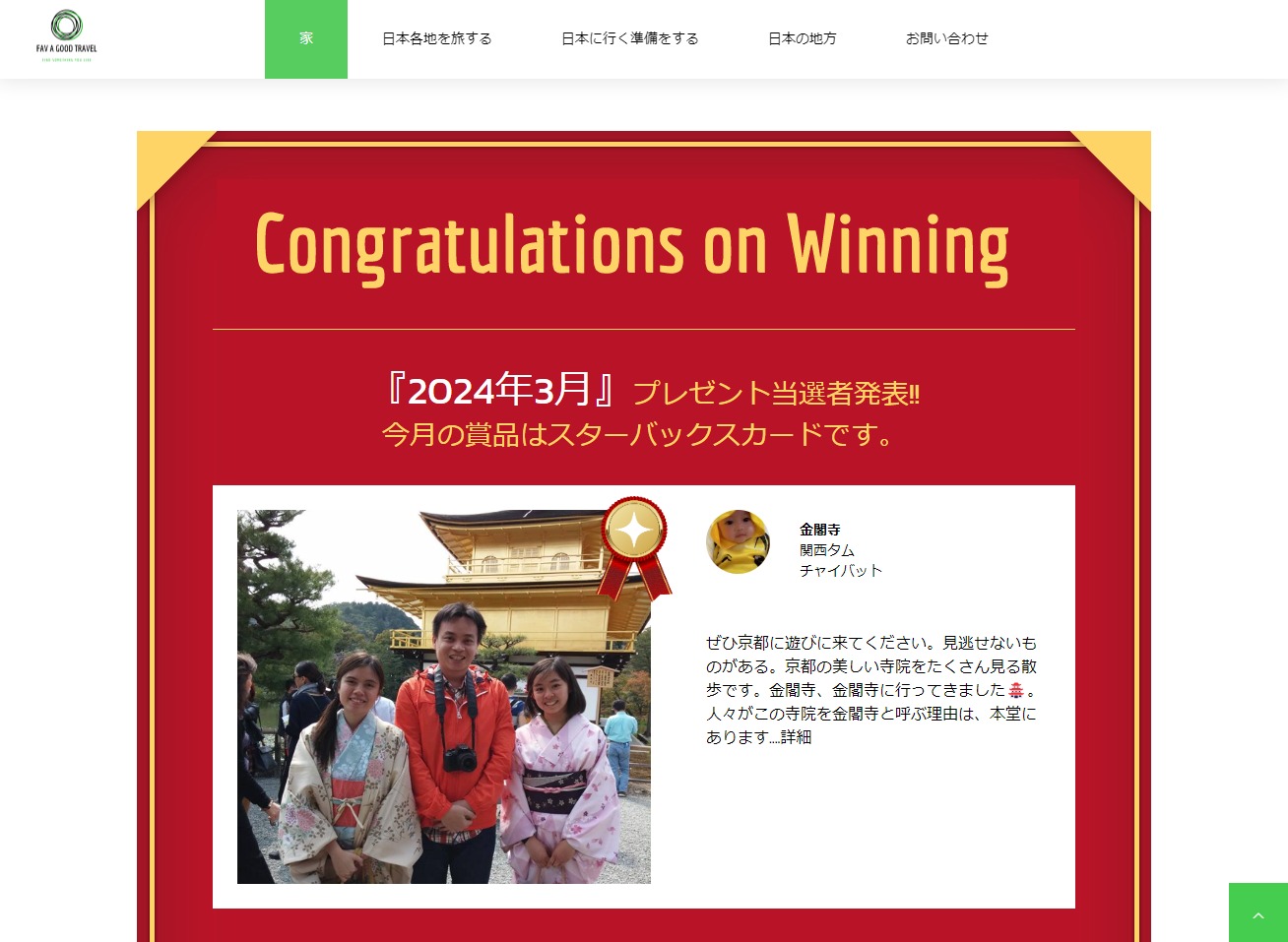 PRESS株式会社フューチャースピリッツ(本社:京都市下京区、代表取締役 谷孝 大、以下「フューチャースピリッツ」)の、タイ王国(以下「タイ」)における子会社Future Spirits (Thailand) Co., Ltd. (以下「フューチャースピリッツタイランド」)は、タイ国内でタイ人向けに、訪日観光に特化したメディア「FAV A GOOD TRAVEL」とレビューサイト「FAV A GOOD TIME」を合わせ月間200万PVを達成。日本の魅力をビジュアルと共感性の高い記事で伝えるメディアとしてタイ人の関心を得て、成長を続けています。