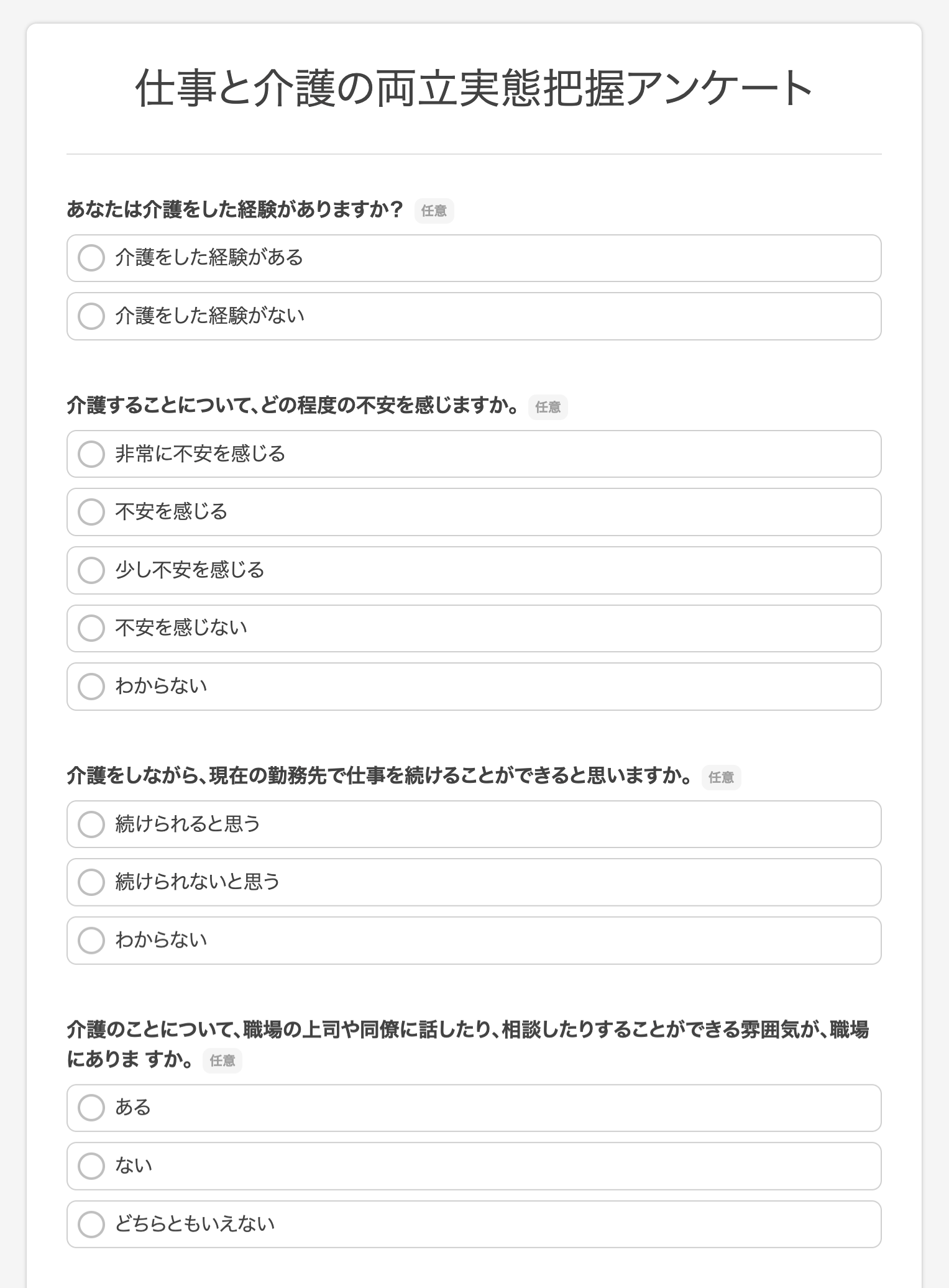 社員の介護に関する実態調査を把握するアンケートフォーム、介護の相談受付窓口の提供など、適切な両立支援を行うための機能も実装しています。
